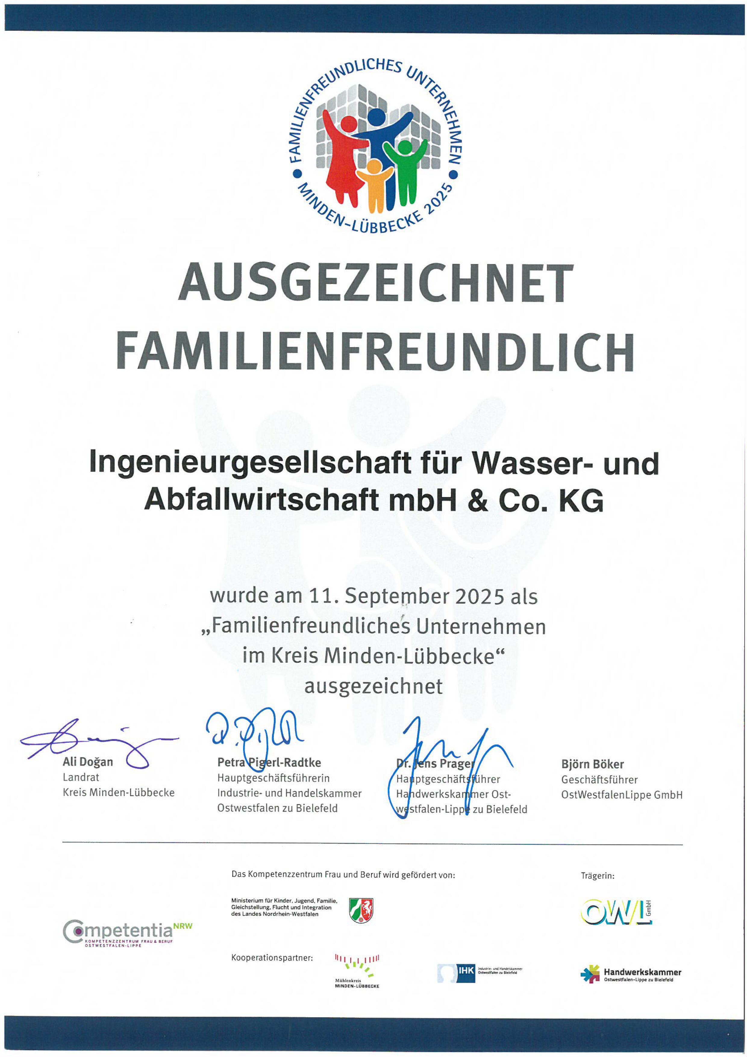 Hierfür wurde die IWA Ingenieurgesellschaft im September 2025 nun erneut als „Familienfreundliches Unternehmen im Kreis Minden-Lübbecke“ ausgezeichnet.